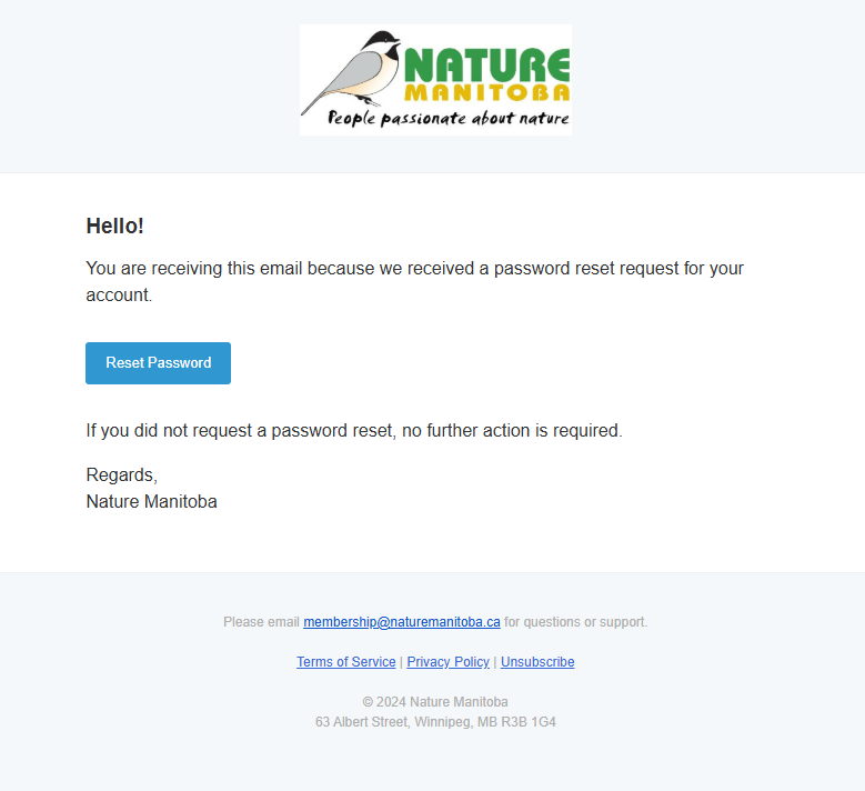 Enter the email address you use for your Nature Manitoba account and select “Send Password Reset Link”