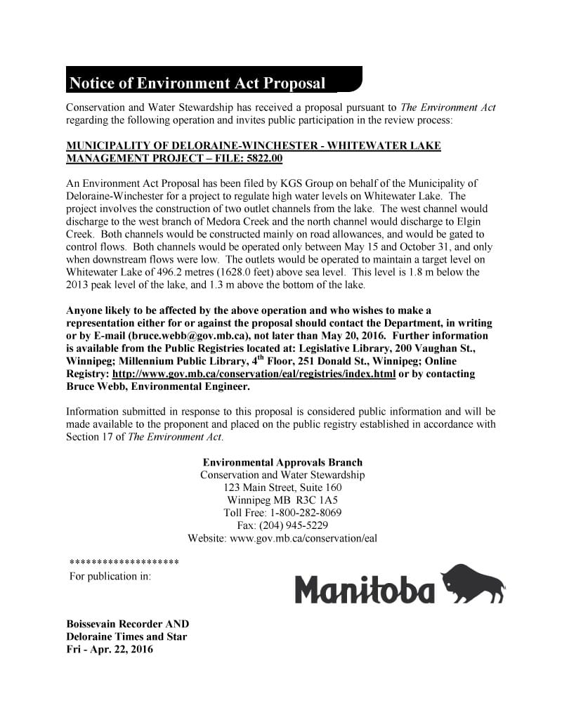 Environmental Act Proposal notice – Whitewater Lake 2016
