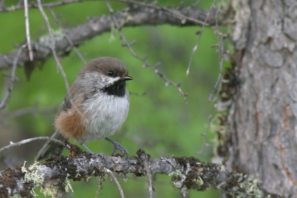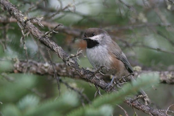 Boreal Chickadees, similar in size to the more conspicuous Black-capped Chickadee, have a brown cap, a small white cheek patch and black bib, a brown back and warm cinnamon/buff flanks.