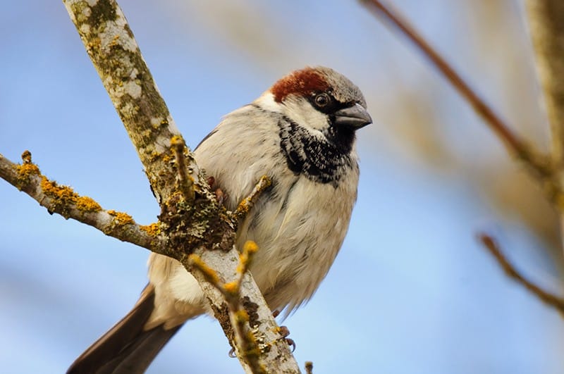 Coloured in shades browns and rusts, House sparrows are of stocky build and a have a shorter tail than our native sparrows. The crown of the head is grey. Males have a black throat-patch and lores (markings on the sides of the face extending from the base of the bill to front of the eye). The wings are decorated with a single white patch, visible in flight.