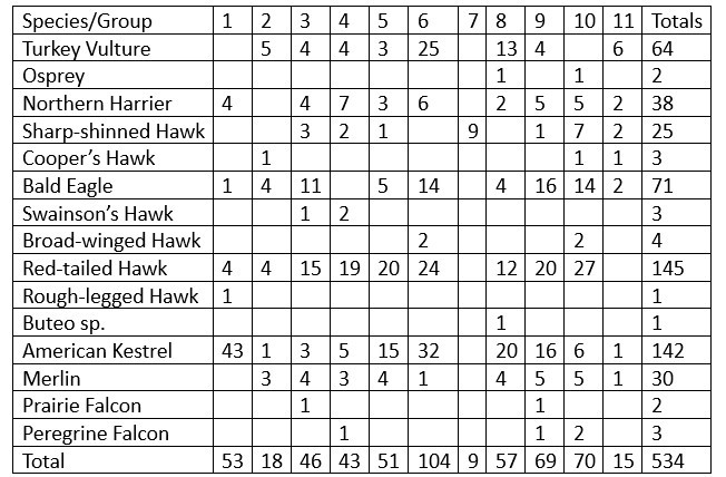 There was excellent coverage during the 2025 fall hawk watch, with eleven groups in the field. The weather cooperated, although one group in particular was hampered by fog and the Westman group had strong winds. Overall raptor variety was excellent, although some species’ tallies were much below normal (Turkey Vulture and Sharp-shinned Hawk). Several observers noted a distinct lack of warblers.