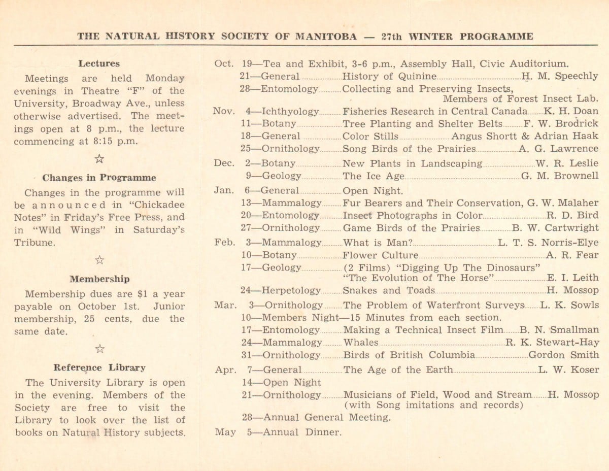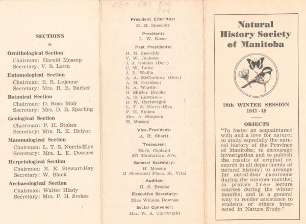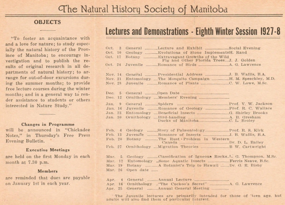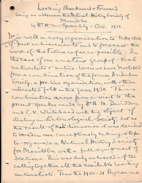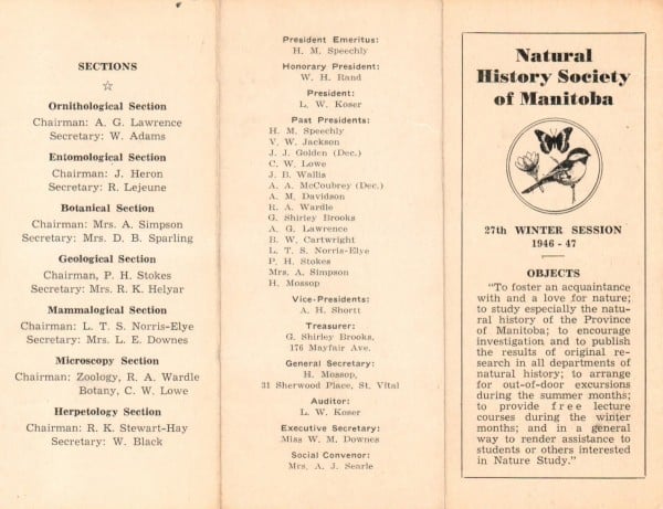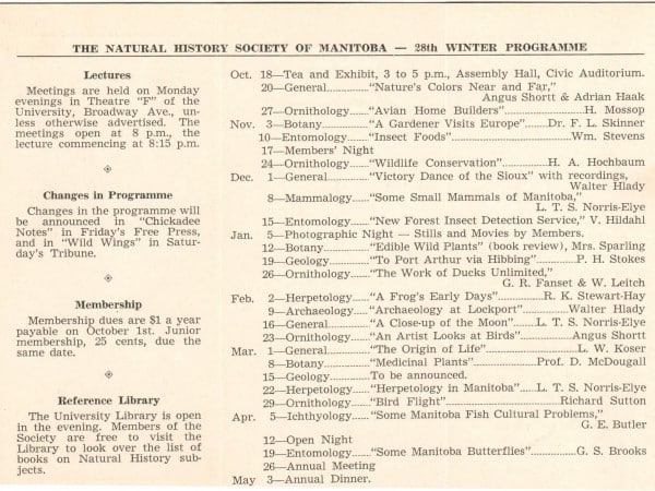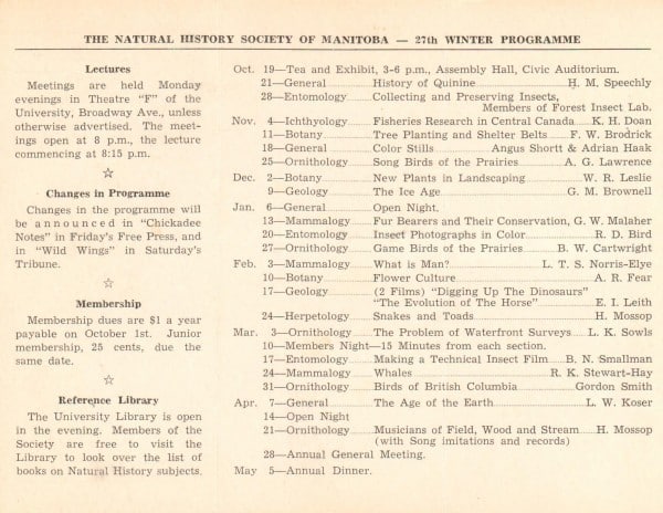 By 1927, member nights were already a key component of the indoor program, and their format has remained consistent over the years. Every year, the AGM includes an address from the president. The following introduction of the 1932 speech by Dr H.M. Speechley is of particular interest as it talks about the formation of the Manitoba Naturalist’s Society.