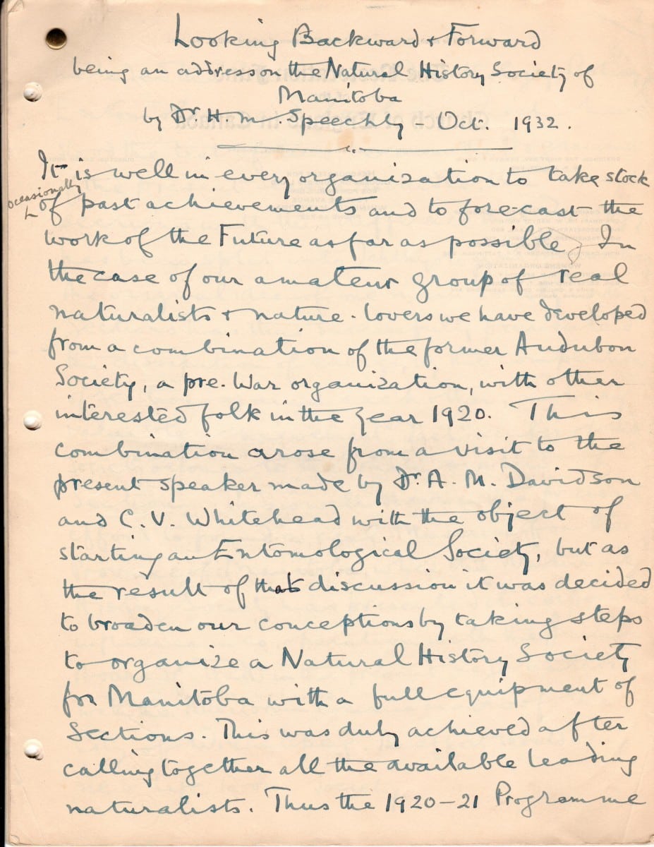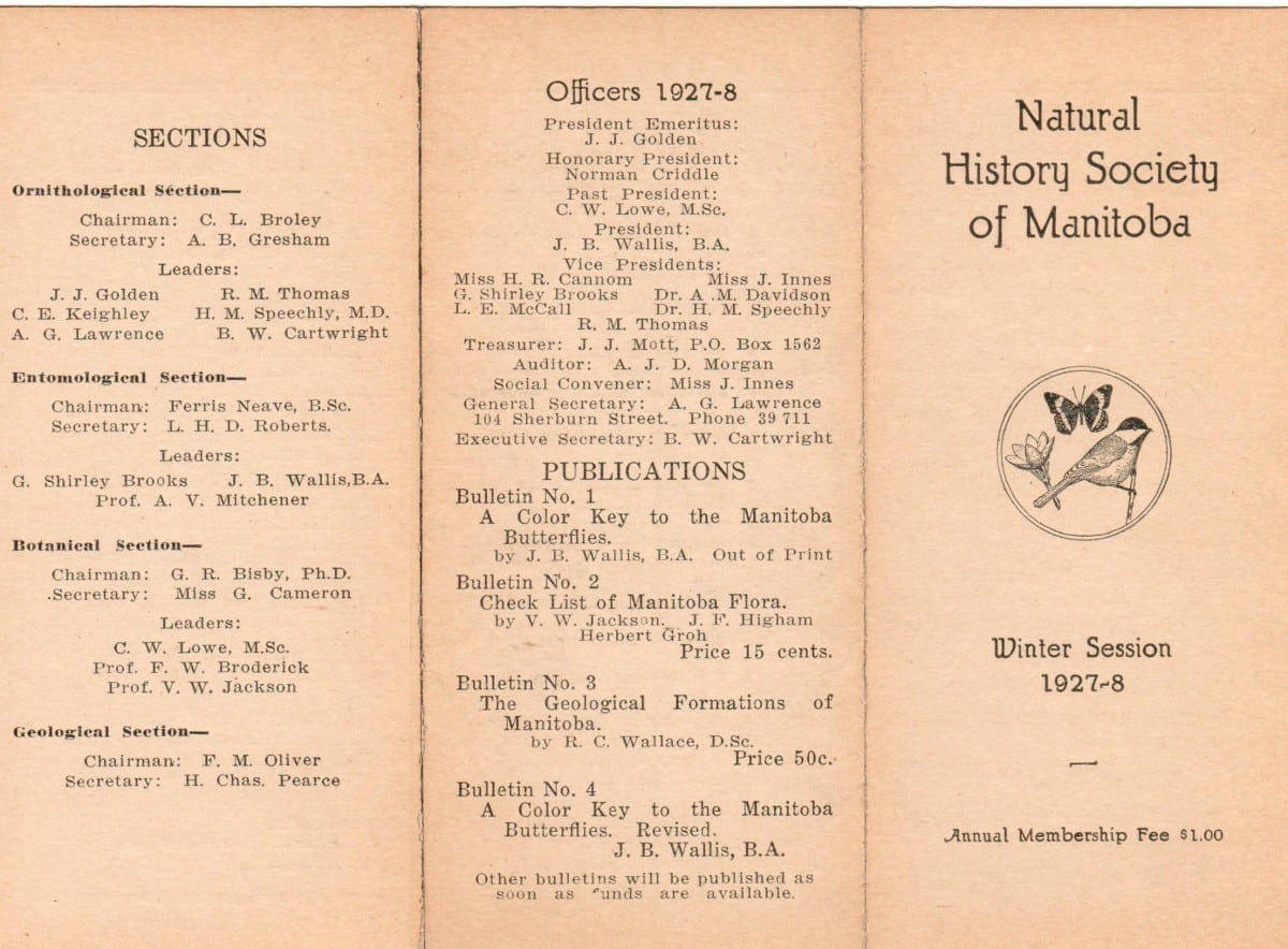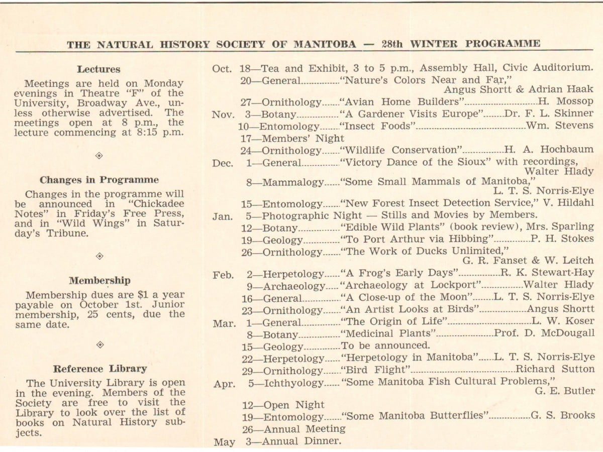 By 1927, member nights were already a key component of the indoor program, and their format has remained consistent over the years. Every year, the AGM includes an address from the president. The following introduction of the 1932 speech by Dr H.M. Speechley is of particular interest as it talks about the formation of the Manitoba Naturalist’s Society.