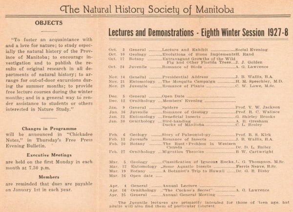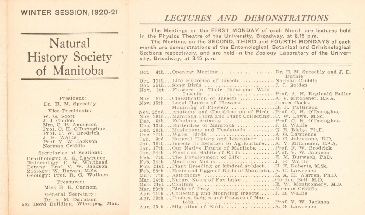 Way back in 1920, Nature Manitoba (then called the Natural History Society) offered four indoor programs per month from October to April! These were the only winter programs offered during NM’s first 50 years. With no television or internet at that time they would have been very welcome activities for NM members.